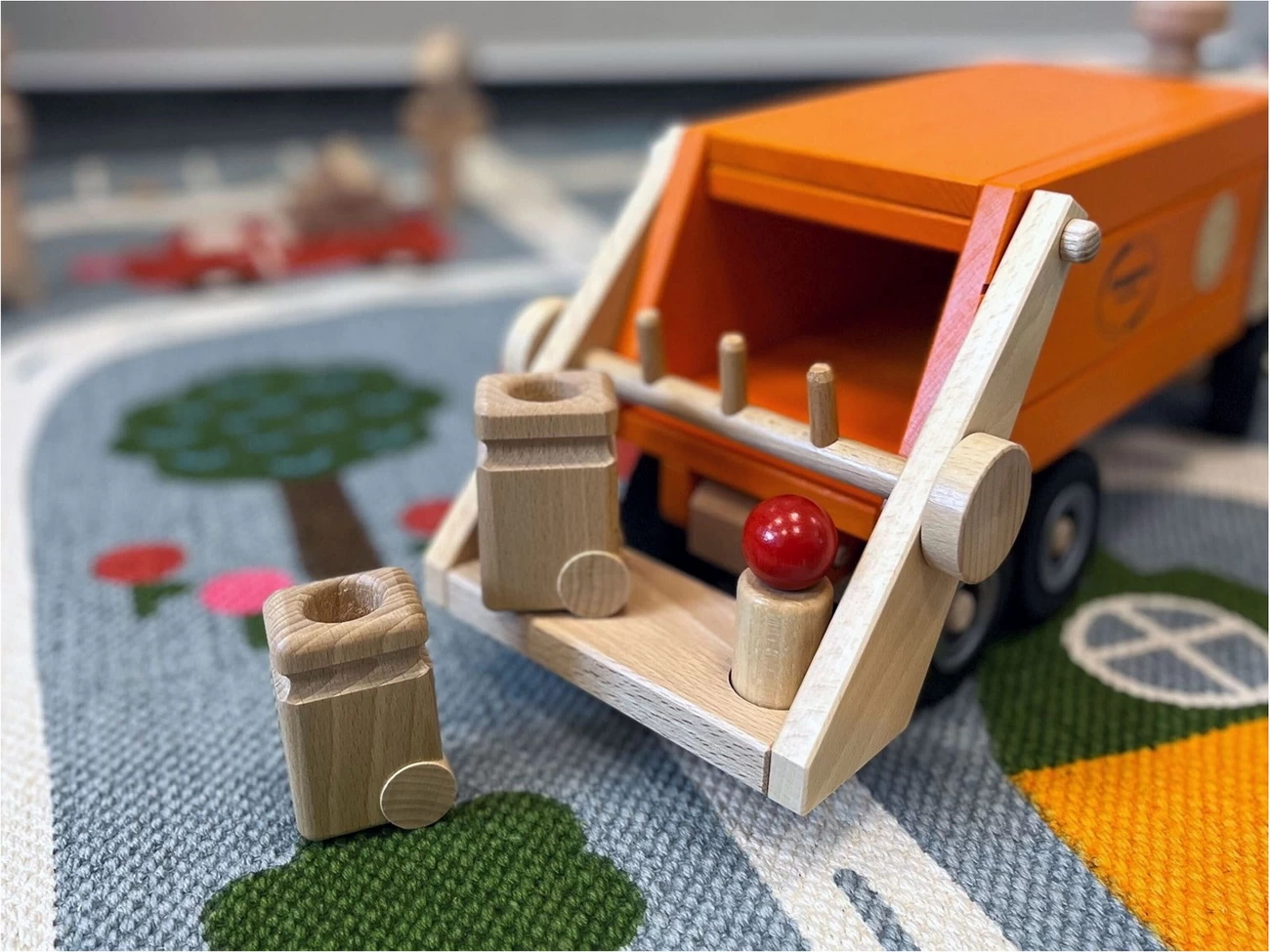 Im Fahrerraum ist Platz für 2 Holzfiguren, 2 weitere Figuren fahren auf der Rampe hinten mit. Genauso wie bei der richtigen Müllentsorgung. Um die beiden mitgelieferten Mülltonnen zu entleeren, kippen Sie diese nach oben. Sobald der Müllkipper voll beladen ist, kann der Container abgeladen werden. Verfügt über leise Räder, ein elegantes Sondereditionszertifikat an der Seite des Lastwagens und einen Knopf an der Vorderseite zum Lenken des Muldenkippers.