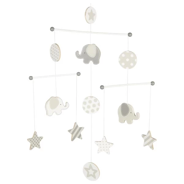 Mobile trifft Lifestyle. Sympathische, knuddelige Elefanten schweben umrahmt von dekorativen Sternen in beruhigendem Entschleunigungsmodus über dem Kinderbett. Da kann Kind nur entspannen und friedvoll ins Reich der Träume einschlummern.