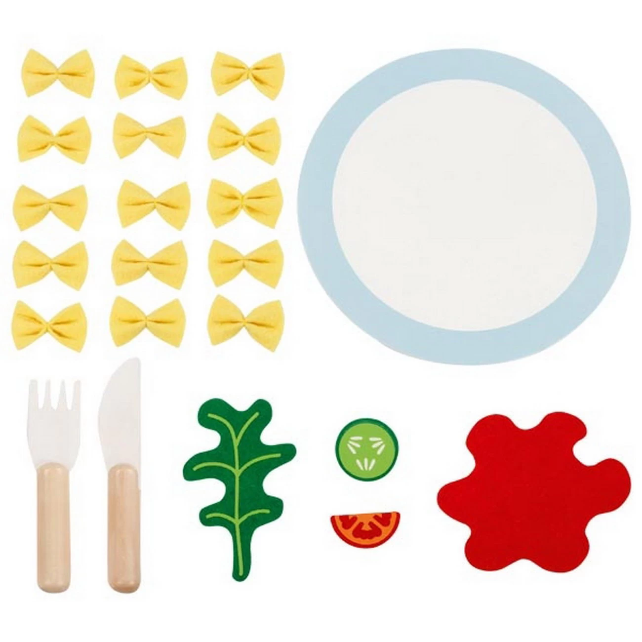 Aus Holz und Filz: Teller, Besteck, Nudeln und alles was dazugehört: Tomate, Gurke, Tomatensosse und Rucola. Für offenes Spiel und Rollenspiele. Vielleicht als Bistro-Angebot im Kaufmannsladen?